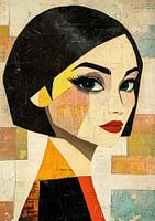 Vrouwenportret - Dit vrouwen schilderij toont een geabstraheerd portret van een vrouw met een samenspel van geometrische vormen en een rijk kleurenpalet, waarbij de expressieve ogen en rode lippen direct de aandacht trekken.
