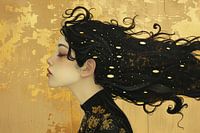 Vrouwenportret - Dit vrouwen schilderij toont een profiel van een jonge vrouw met zwart, wervelend haar versierd met gouden stippen, tegen een achtergrond van gemarmerd goud.