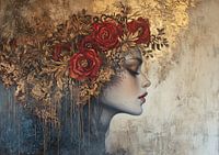 Vrouwenportret - Dit vrouwenportret schilderij toont een zijprofiel van een vrouw met een rijkelijk versierd hoofddeksel vol rode rozen en gouden accenten, tegen een gedetailleerde, textuurrijke goud en blauwgrijze achtergrond.