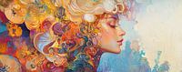 Vrouwenportret - Dit vrouwen schilderij toont een elegant portret van een vrouw, wiens gezicht vredig oogt en omhuld is door levendige, kleurrijke abstracte patronen die reminiscenties oproepen aan de Rococo stijl, met een spel van gouden, blauwe en rode tinten die dynamisch over het canvas dansen.