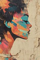 Vrouwenprofiel | Chromatic Silhouette - Dit vrouwen schilderij toont een zijprofiel van een vrouw met een levendige, kleurrijke graffiti-stijl op een ruwe, verweerde muur, waardoor een opvallende contrast ontstaat tussen het kunstwerk en zijn achtergrond.