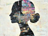 Vrouwenprofiel | Patchwork Persona - Dit vrouwen schilderij toont een zijprofiel van een vrouw samengesteld uit diverse kleurrijke en abstracte patches, wat het een dynamische en moderne uitstraling geeft.