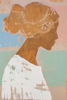 Vrouwenprofiel | Urban Elegance - Dit vrouwen schilderij toont het profiel van een vrouw met een elegant opgestoken kapsel, uitgebeeld in expressieve, abstracte penseelstreken van roestbruin en pasteltinten tegen een achtergrond met groene en roze vlakken, wat een stedelijke, industriële uitstraling geeft.