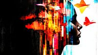 Een abstract, kleurrijk ontwerp met een pixel-sorterend effect dat overloopt in het profiel van een vrouw. Delicate vlinders geven de afbeelding een poëtisch en esthetisch tintje.