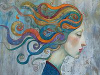 Vrouwenprofiel - Dit vrouwen schilderij toont een zijprofiel van een vrouw met gesloten ogen, omgeven door kleurrijke, gestileerde slierten haar die in de wind lijken te dansen, uitgevoerd in een surrealistische stijl.