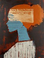 Vrouwenprofiel - Dit vrouwen schilderij toont het profiel van een vrouw, gecreëerd met scherpe lijnen en contrasterende ruwe textuur, waarbij de oranje, blauwe en witte tinten op een donkerbruine achtergrond samensmelten om een krachtige uitstraling van urban industrial art weer te geven.