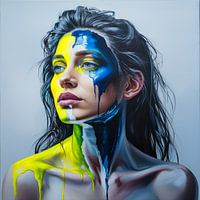 De levendige kleuren, met dynamische achtergronden en surrealistische elementen, plaatsen het portret in een nieuwe context en stimuleren de verbeelding.