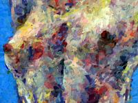 Contemporary art. Expressionisme. Past in een modern interieur. Moderne kunst voor mensen die houden van gedurfde kunstwerk. Schilderij van naakt vrouwelijk torso is met acrylverf geschilderd op schildersdoek. De foto van het schilderij is iets digitaal bewerkt. De verf en het canvas is nog goed te zien.c