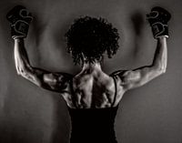 De afbeelding toont een vrouw met krullend haar die van achteren wordt gezien, gekleed in een mouwloos shirt en bokshandschoenen. De persoon spant zijn armen, waardoor goed ontwikkelde spieren zichtbaar worden. De afbeelding is in zwart-wit, wat de spierdefinitie en de textuur van de huid benadrukt. De persoon lijkt in een sterke en krachtige houding te staan, wat interessant is omdat het fysieke kracht en fitheid uitstraalt.