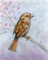 Breng de zachte charme van de natuur in huis met deze kunstzinnige print van een vrouwtjesmus, liefdevol weergegeven op een bloesemtak. Deze illustratie is met zorg met de hand getekend in een combinatie van aquarel en kleurpotlood. Warme bruin-, rood- en geeltinten brengen het verenkleed tot leven, terwijl de achtergrond met zachte…
