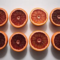 Deze compositie van gesneden bloedappelsienen op een witte achtergrond creëert een kleurrijk en symmetrisch patroon. De rijke roodtinten van het fruit contrasteren met de heldere schil, wat een visueel aantrekkelijke en verfrissende uitstraling geeft.