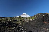 Vulcán Osorno, Chili. Lavasteen, blauwe lucht, halve maan. van A. Hendriks
