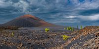De Arena Negras zone, een schijnbaar eindeloze uitgestrektheid van vulkanisch puin, strekt zich voor ons uit als een zwart-wit schilderij. De korrelige structuur van de lavalagen contrasteert met de duisternis van de hemel, die bedekt is met zware wolken. Te midden van dit harde landschap ziet de vulkaan Chinyero er nog krachtiger en indrukwekkender uit.