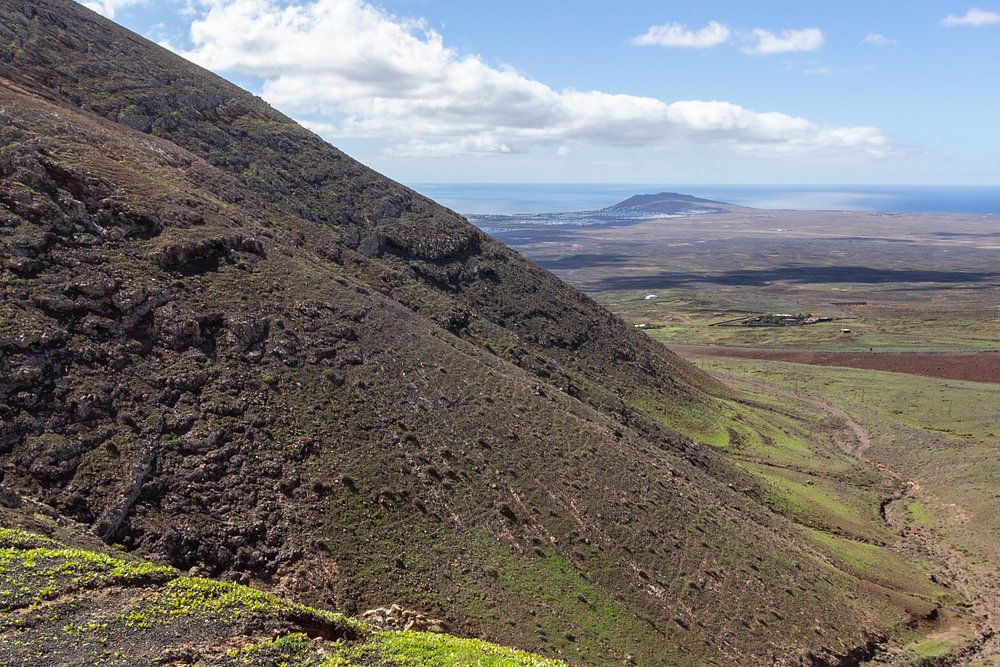 Vulkaanlandschap in het zuiden van Lanzarote met bergen en de Atlantische Oceaan op de achtergrond