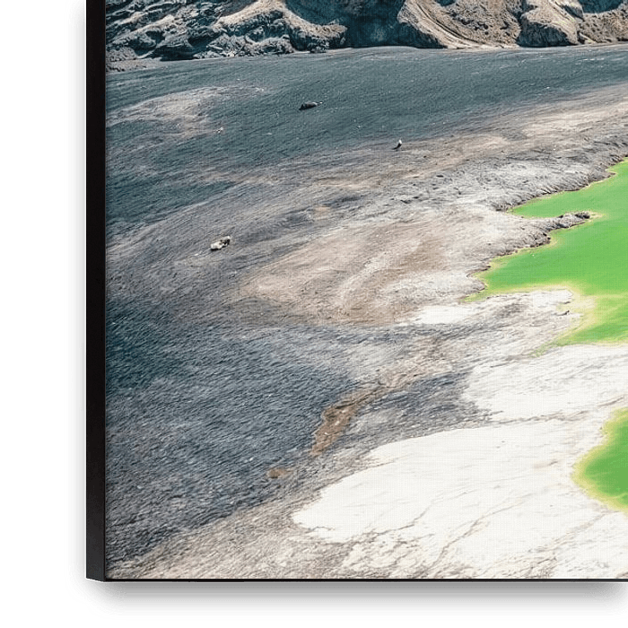 Deze spectaculaire foto toont de rauwe, ongetemde schoonheid van een vulkaanlandschap. In het midden ligt een helder smaragdgroen kratermeer dat schittert tussen de donkere, gelaagde rotswanden. Het intense groen van het water vormt een fascinerend contrast met de zwarte en grijze vulkanische rotsen die het bekken omlijsten. De…
