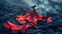 Dit buitengewone fotografische beeld toont een vrouw in een jurk gemaakt van lava. Is dat wel mogelijk? Ja, dat is mogelijk in deze AI-foto. Het kleurenpalet weerspiegelt het geologisch jonge landschap van IJsland, dat wordt gekenmerkt door vulkaanuitbarstingen: alle roodtinten steken af tegen diepzwart. De rode jurk heeft een losse, vloeiende snit die doet denken aan de beweging van verse lava. De zoomlijnen weerspiegelen de onregelmatige vormen van gestolde lava. Het beeld straalt elegantie en mystiek uit. Breng dit magische moment aan de muur in een breed 16:9 formaat - hoe groter, hoe beter.