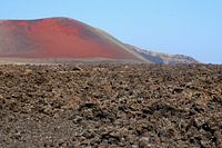 Onherbergzame, ruige vlakte, lavasteen, lavagesteente, vulkanische lavavelden en rode vulkaan. Uitzichtpunt (viewpoint) in Timanfaya Nationaal Park, Lanzarote, Spanje. Het eiland met vulkaankraters is deels bedekt met gestolde lava. Surrealistisch vulkaanlandschap alsof je op de maan of de planeet Mars bent. Buitenaards, niemandsland.