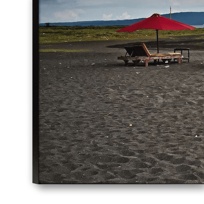 Deze scène toont een donker vulkanisch zandstrand, waar een rij houten ligstoelen en rode parasols op een rij staan met uitzicht op de horizon. Toch rust er niemand uit. De setting roept een zweverige sfeer op, alsof het strand net verlaten is, vlak voor de komst van een storm die te zwaar is om te negeren. De lucht is bezaaid met zware, dikke, grijze, bijna wervelende wolken, die de indruk wekken van een dreigende natuurkracht. Het contrast tussen de felrode paraplu's, het zwarte zand en de dramatische lucht geeft het beeld een filmische esthetiek. In de verte zien we de silhouetten van de bergen, wat het idee van een wilde, authentieke plek aan de rand van een tropische zee versterkt. Alles lijkt bevroren in verwachting. Je kunt de wind bijna voelen. Dit tafereel toont een strand dat klaar is om bezoekers te verwelkomen, maar volledig overspoeld wordt door de dreigende lucht. Het landschap wordt een tafereel waar de natuur het tempo dicteert en respect, verwachting en stilte afdwingt voor de regen.
