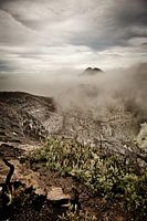 Deze foto legt een van de meest emblematische momenten van Kawah Ijen vast: wanneer de vulkanische mist zachtjes opstijgt en de kraterwanden bijna volledig bedekt. De contrasten zijn indrukwekkend. Op de voorgrond klampen, ondanks de droogte en de zwavelbranden, een paar lage planten zich vast aan de minerale grond, terwijl andere…