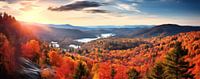 Deze prachtige afbeelding vangt de essentie van een heldere herfstdag bij zonsopkomst. De zon werpt haar eerste stralen over een landschap rijkelijk gevuld met bomen in een scala van herfstkleuren, van diep rood tot fel oranje, afgewisseld met het nog aanwezige groen van de naaldbomen.