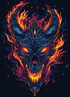 Een dreigend demonengezicht rijst op uit de donkere diepte, omringd door laaiende vlammen. De scherp gedefinieerde blauwe schubben van het wezen contrasteren met de intense rode tinten van het vuur. De gloeiende ogen en brandende mond geven het tafereel een griezelige, bovennatuurlijke uitstraling. De gebogen hoorns, doorweven met vlammen, versterken de angstaanjagende uitdrukking. Donkere schaduwen en felle kleuren creëren een dynamisch, bijna levendig effect dat het wezen nog imposanter maakt.