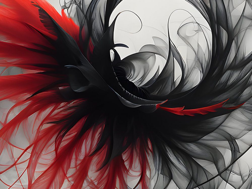Dit kunstwerk vangt de essentie van beweging en contrast met een dynamische compositie van structuren die doen denken aan veren en rook. De organische lijnen en vloeiende bewegingen geven het geheel een levendige energie, terwijl de wisselwerking tussen het diepe zwart en het vurige rood een krachtige visuele impact creëert. De gelaagde vormen en delicate texturen suggereren een gevoel van diepte en complexiteit, waardoor het oog van de toeschouwer continu nieuwe details ontdekt.