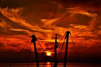 Zonsondergang bij de haven van Harlingen met de mast van een vissersboot in de voorgrond