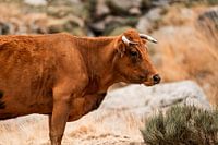 Deze betoverende foto toont een roodbruine koe met korte, gebogen hoorns tegen een achtergrond van droge grasvelden en verweerde rotsen. De warme kleuren van het dier en de omgeving harmoniëren prachtig, terwijl de zachte lichtval de rijke textuur van de vacht benadrukt. De rustige houding van de koe straalt een natuurlijke gratie uit en vangt de eenvoud en schoonheid van het plattelandsleven. Een perfect kunstwerk voor liefhebbers van authentieke en rustieke sferen.