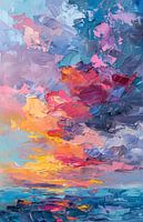 Levendige en kleurrijke reflectie van een zonsondergang over water, geïnterpreteerd door de lens van het impressionisme. De dikke, textuurrijke penseelstreken in een veelheid aan kleuren, van koelblauw en zacht lavendel tot diep roze en vurig oranje, brengen een zintuiglijke ervaring teweeg.