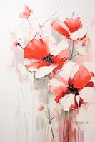 Dit betoverende digitale schilderij toont een verzameling van levendige klaprozen, zwevend tegen een zacht, wazig witte achtergrond. De klaprozen, met hun rijke rode en zachte roze tinten, lijken in beweging te zijn, alsof een zachte bries door hun bloemblaadjes speelt. Druppels van verf accentueren de dynamiek van het tafereel, waardoor het geheel een gevoel van spontaniteit en levenslust uitstraalt. De donkere centra van de bloemen contrasteren prachtig met hun stralende bloemblaadjes, waardoor een gevoel van diepte en dimensie ontstaat.