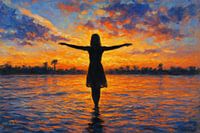 Een donkere figuur met open armen staat in ondiep water terwijl de lucht oplicht in vurige oranje tonen tegen koele blauwe wolken. Het spiegelende oppervlak laat golvende reflecties en zachte penseelstreken zien, waardoor diepte en beweging ontstaan. Het contrast tussen de warme horizon en de rustige tinten op het water creëert een…