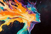 Een fascinerende fusie van kleur en expressie ontvouwt zich hier als levendig oranje en mystiek blauw in dynamische golven uit de geest van een vrouw stromen. Deze krachtige stromingen weerspiegelen creativiteit en passie, ideaal voor een werkkamer waar inspiratie en verbeelding altijd kunnen floreren.