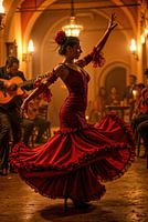 De essentie van flamenco ontvouwt zich in een warme kamer met kaarslicht. De danseres, in een prachtige rode jurk, belichaamt pure elegantie en drama. Haar bewegingen zijn soepel en krachtig tegelijk, met elke stap vertelt ze een verhaal van liefde, verlies en ongebreidelde levensvreugde. De zwierigheid van haar jurk, die kunstig is vormgegeven in verschillende lagen, benadrukt de dynamiek van haar optreden, terwijl de dieprode kleur staat voor passie en intensiteit.