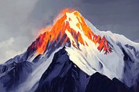 De gloeiende top van een majestueuze berg, omlijst door ruige, besneeuwde hellingen, straalt indrukwekkende energie uit. De felle oranje tinten in contrast met het diepe grijs van de lucht vormen een fascinerende blikvanger. Dit kunstwerk vindt zijn ideale plaats in de woonkamer, waar het gesprekken stimuleert en de ruimte vult met…