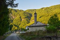 De oude houten moskee van Vusanje in Montenegro bij valavond. Dit dorpje, gelegen vlakbij de Albanese grens, wordt volledig bewoond door etnische Albanezen, die het Vuthaj noemen.