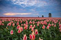 Een geel met rood gevlamd tulpen veld op de voorgrond, drie molens en een zonsondergang. Nog meer "ik hou van Holland" worden ze niet...