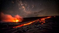 Dit indrukwekkende beeld toont de rauwe kracht van een actieve vulkaan, waarvan de gloeiende lava als een vurige rivier door het donkere landschap stroomt. De felrode lavastroom staat in schril contrast met het diepe zwart van de nacht, terwijl de opstijgende rookwolken intens oranje gloeien. Een adembenemende sterrenhemel ontvouwt zich op de achtergrond en onthult het immense contrast tussen de rust van het universum en de explosieve energie van de aarde.