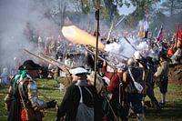 Een slagveld scene in actie met sfeervol natuurlijk invallend zijlicht van de zon wat een Rembrand licht effect meegeeft aan deze foto. Buskruid dampen en rokende vuurwalmen schieten uit de loop van een vurende musket. Een compagnie musketiers van het staatse leger vuurt hun musketten af op de Spaanse troepen.