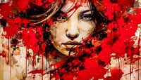 Het schilderij "Fire of Emotions" straalt een intense, krachtige dynamiek uit. De dominante rode tinten, die als uitgebarsten lava over het doek lijken te stromen, symboliseren sterke emoties zoals passie, woede en vastberadenheid. De vrouw in het midden met een ernstige uitdrukking vangt de kijker met haar intense blik. Ze lijkt kwetsbaar en sterk tegelijk, alsof ze een innerlijk conflict ervaart of een belangrijke beslissing heeft genomen. Haar gelaatstrekken, fijn gemodelleerd en subtiel gearceerd, contrasteren met de krachtige, wilde penseelstreken en kleurexplosies om haar heen.