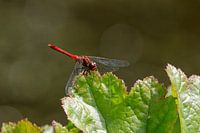 Een fel rode libelle, genaamd vuurlibel. Deze heeft haar plek gevonden op een groen blad. De lichaamslengte van deze volwassen Libellula erythraea ligt tussen 3,5 en 4,5 centimeter.