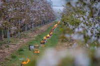 Het zijn vuurpotten die bij een boom worden gezet om de bloesem te verwarmen.