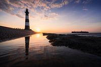 De zon gaat onder bij het strand van Breskens, waar de vuurtoren weerspiegelt bij de dijk.