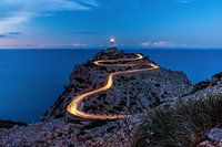 Na zonsondergang op het blauwe uur kun je prachtige lichtsporen van rijdende auto's fotograferen bij Cap Formentor.