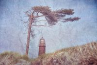 Vuurtoren Darsser Ort gefotografeerd vanaf het strand met een meevaller. Een zicht op de Baltische Zee