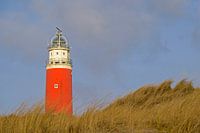 Achter het helmgras staat de rode vuurtoren Eierland bij De Cocksdorp