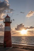 De reflectie van de zonsondergang op het wateroppervlak creëert een spiegelachtig effect, waardoor de scène nog mooier wordt. De lucht boven de vuurtoren is gevuld met hier en daar een wolk, terwijl de zon langzaam richting de horizon gaat. Een sfeer van rust en contemplatie omhult de foto, waar de vuurtoren fungeert als een stille getuige van de prachtige overgang tussen dag en nacht.