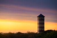 Kaapduinen Laag, één van de twee kleine lichtopstanden in Dishoek, staat onder een kleurrijke lucht in de duinen, net na zonsondergang. De kleuren van de vuurtoren passen fraai bij de lucht.