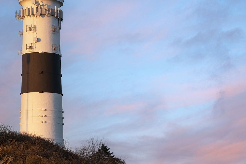 Panoramafoto van de vuurtoren van Kampen op Sylt bij zonsondergang, Noord-Friesland, Duitsland