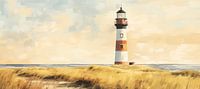 Vuurtoren Kunst - Dit schilderij toont een pittoreske vuurtoren, prominent aanwezig tegen een luchtig hemelachtergrond, met een veld van goudgele grassen op de voorgrond. Het werk gebruikt een gestileerde, bijna blokachtige penseelvoering die een moderne, haast digitale aandoening geeft, terwijl het palet warme beige en bruine tinten gemengd met oranje accenten bevat.