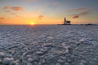 Het Paard van Marken omgeven door het ijs. Winter 2021 was koud genoeg om het Markermeer dicht te laten vriezen, door de wind is het ijs tot allerlei vormen gevormd. De zon komt net boven de horizon op.